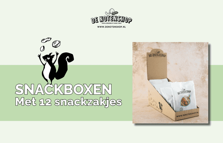 Nieuw in het assortiment van De Notenshop zijn de handige snackboxen met 12 kleine zakjes. Op dit moment zijn er vijf verschillende soorten: noten trio geroosterd, elite haver, proteïne power mix, natuurmix en snackmix fajita style. Voor welke ga jij?