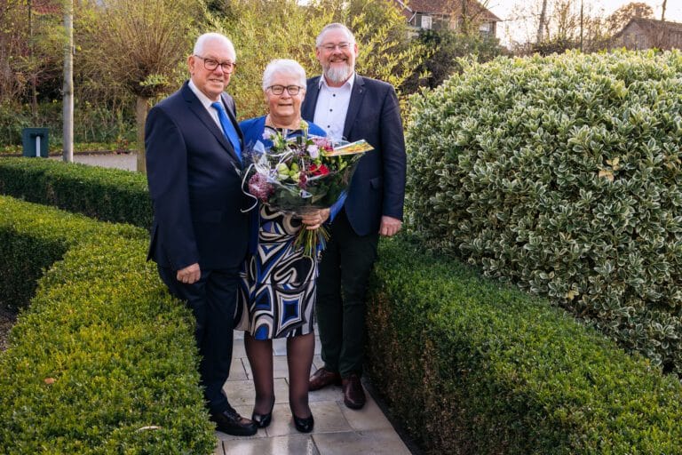 Het was vandaag 60 jaar geleden dat de heer J.A. Terlouw (83) en mevrouw W. Terlouw-Romijn (81) uit Strijen elkaar het jawoord gaven. Wethouder Huibert Steen ging vanmiddag langs met een mooie bos bloemen. Hij feliciteerde hen namens het gemeentebestuur met dit diamanten jubileum.