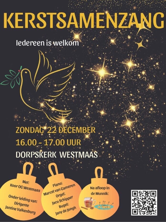 Na het succes van vorig jaar organiseert Koor OG Westmaas opnieuw een sfeervolle kerstsamenzang in de Dorpskerk van Westmaas op zondag 22 december.