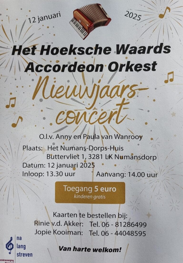 Het Hoeksche Waards Accordeonorkest NLS, onder leiding van Anny en Paula van Wanrooy, nodigt u van harte uit voor hun sfeervolle Nieuwjaarsconcert! Laat u betoveren door prachtige accordeonmuziek en begin het nieuwe jaar met een unieke muzikale ervaring.