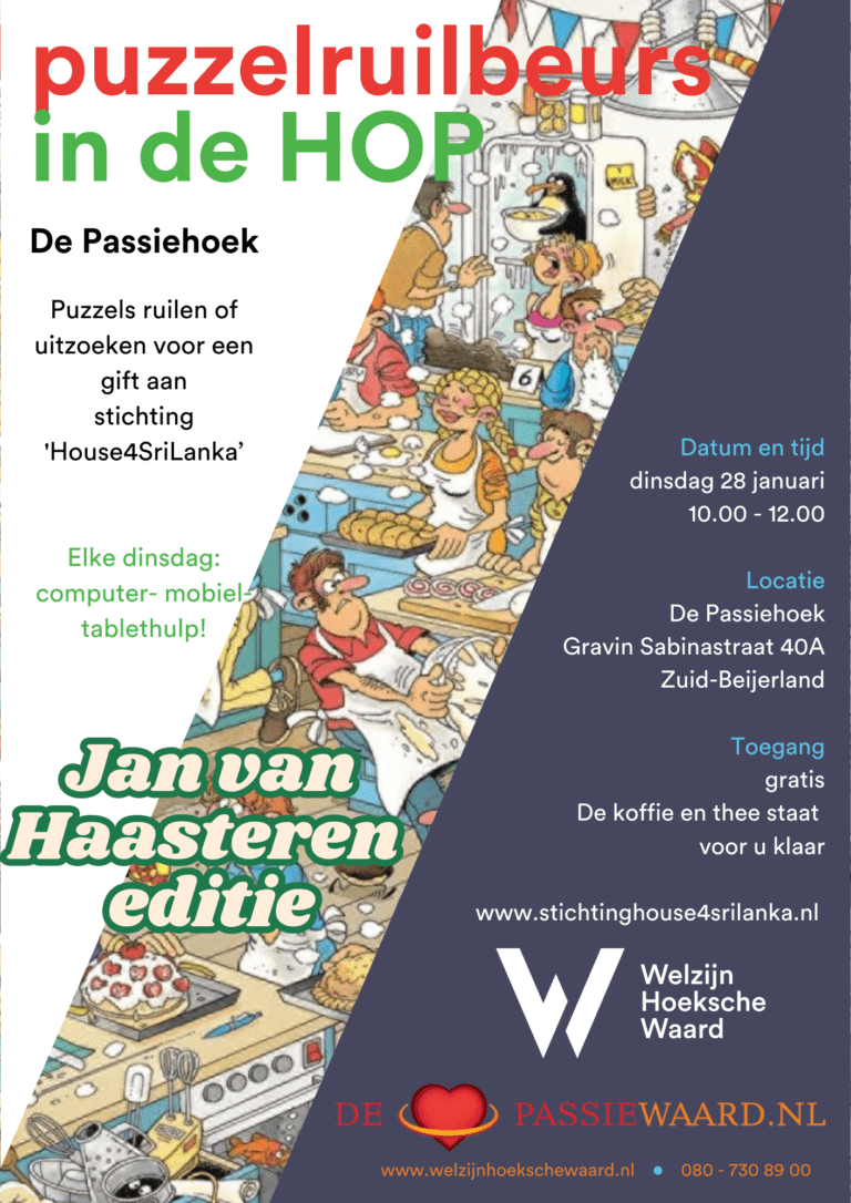 Zuid-Beijerland – Dinsdag 28 januari tussen 10 en 12 uur tijdens de HOP in de Passiehoek, is er een leuke ruilbeurs voor Jan van Haasteren-puzzels. Zegt het voort!