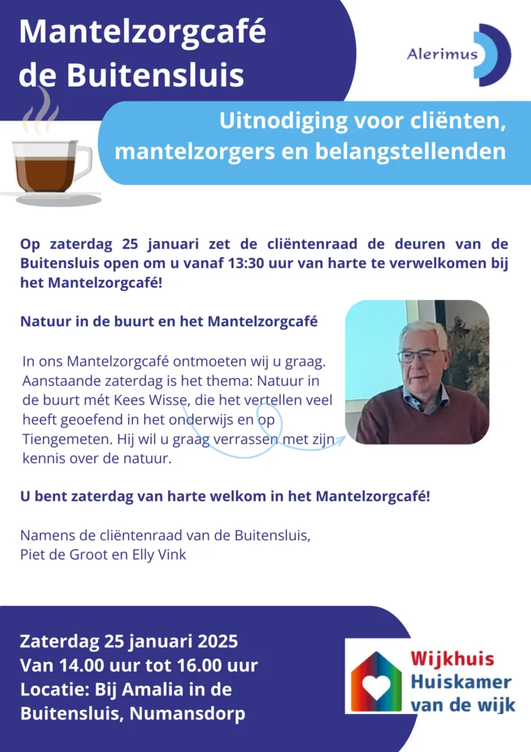 Zaterdag 25 januari wordt van 14:00 tot 16:00 uur door de cliëntenraad van Alerimus (locatie de Buitensluis) in Numansdorp een Mantelzorgcafé georganiseerd voor mantelzorgers, cliënten en belangstellenden.