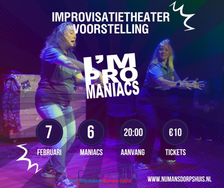 Numansdorp – Op vrijdagavond 7 februari staan de Impromaniacs weer op de planken in het Numans-Dorps-Huis. Bereid je voor op een avond vol hilariteit, verrassende wendingen en interactie, want de scènes worden volledig geïmproviseerd op basis van suggesties van het publiek. Het verhaal, de personages en de dialogen ontstaan ter plekke, wat zorgt voor een unieke voorstelling die elke keer anders is.