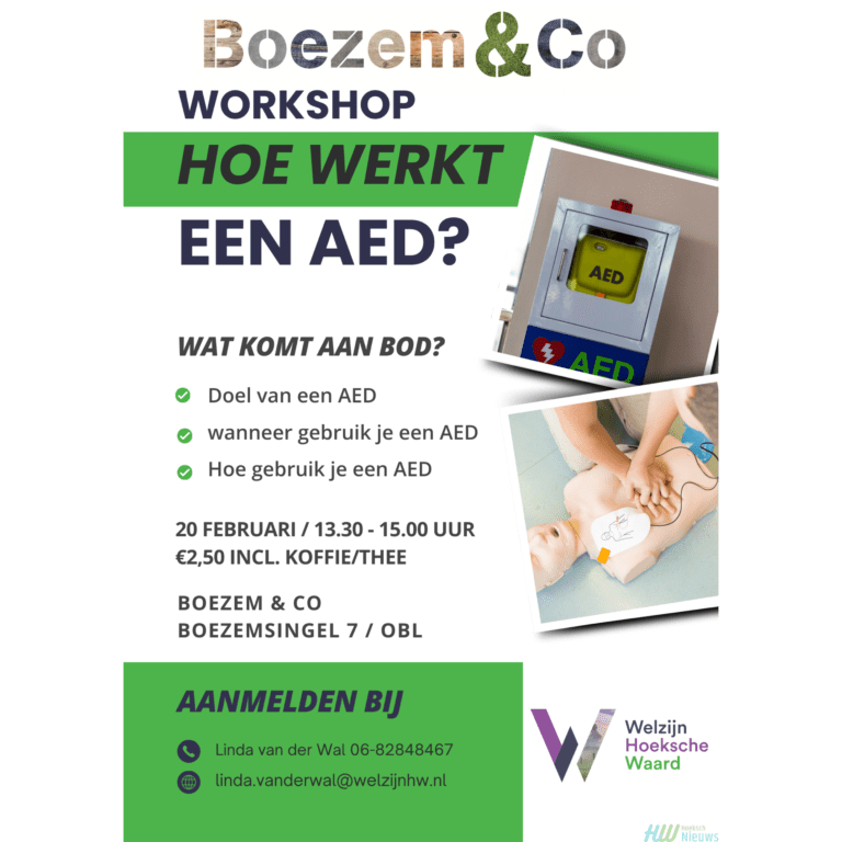 Ziet u ze ook wel eens hangen in winkels, uw appartementencomplex of openbare gebouwen? De AED: Automatische Externe Defibrillator. Hoe werkt het eigenlijk en mag iedereen eigenlijk zo’n ding van de muur halen in geval van nood? Op donderdag 20 februari komt voormalig huisarts Kees van der Wal dat allemaal vertellen, uitleggen en laten zien in Boezem & Co.