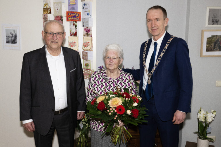 Vandaag was het 70 jaar geleden dat de heer L. Dekker (91) en mevrouw J. Dekker-van Geemert (89) elkaar het jawoord gaven. Burgemeester Erik van Heijningen feliciteerde het echtpaar vanochtend namens het gemeentebestuur met hun platina huwelijksjubileum en bracht een mooi boeket bloemen mee. Ze wonen nog zelfstandig en zijn beiden nog in ‘goede’ gezondheid.