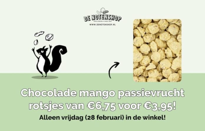 Op vrijdag 28 februari heeft De Notenshop in de winkel een onweerstaanbare aanbieding voor jou! De nieuwe ‘Chocolade mango passievrucht rotsjes’, een heerlijke combinatie van witte chocolade, zoete mango en frisse passievrucht, zijn dan verkrijgbaar voor slechts €3,95 in plaats van €6,75. Dat wil je niet missen!