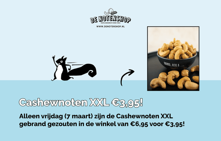 Het is weer tijd voor een heerlijke actie bij De Notenshop! Deze week scoor je de XXL gebrande en gezouten cashewnoten (400 gram) voor slechts €3,95 in plaats van €6,95! Knapperig en vol van smaak – daar ga je echt van genieten!