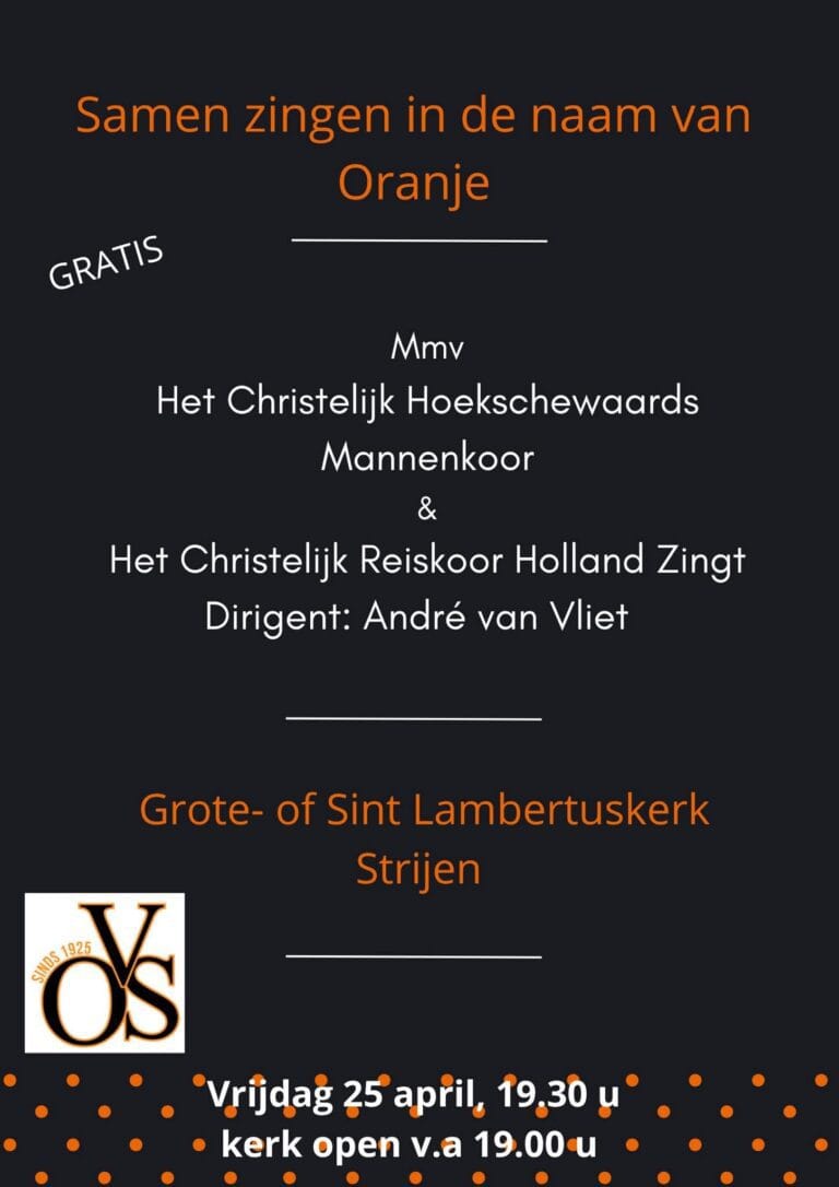 Strijen – Op vrijdag 25 april wordt Koningsnacht in Strijen feestelijk gevierd met een bijzonder muzikaal evenement in de Grote- of Sint Lambertuskerk. Onder het motto “Samen zingen in de naam van Oranje” wordt een gratis koorconcert georganiseerd met medewerking van het Christelijk Hoekschewaards Mannenkoor en het Christelijk Reiskoor Holland Zingt. Het geheel staat onder leiding van dirigent André van Vliet.