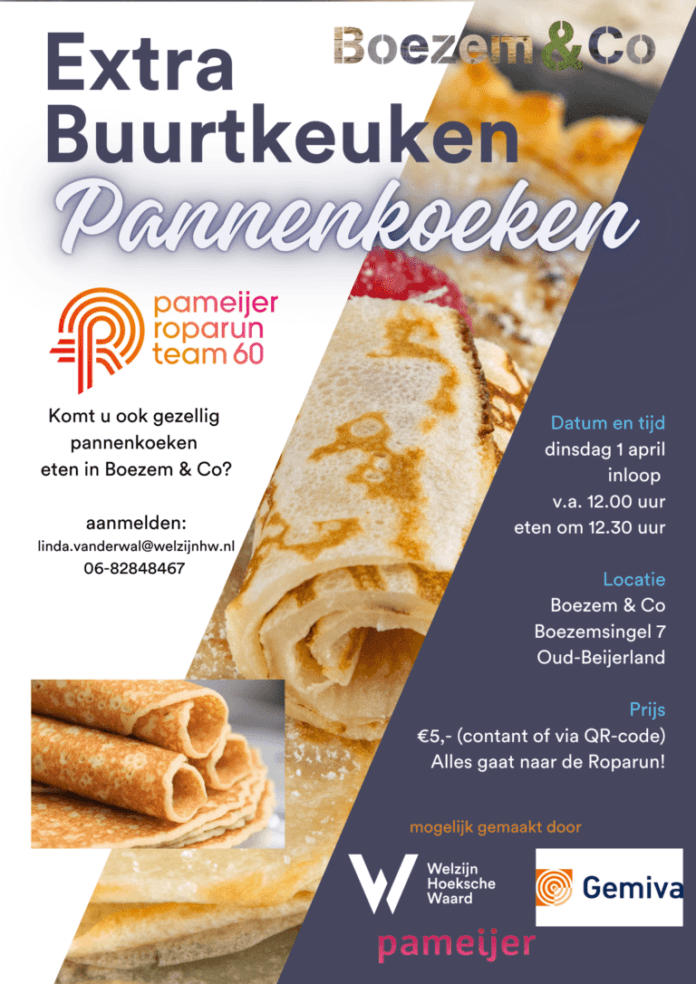 Nee, het is geen grap! In Boezem & Co wordt op 1 april een extra Buurtkeuken georganiseerd ten bate van de Roparun. Welzijn Hoeksche Waard, Pameijer en Gemiva slaan de handen ineen en bakken pannenkoeken voor dit goede doel. Mee-eten kost €5,- (contant). Alle opbrengsten komen ten goede aan het Pameijer Roparunteam 60.