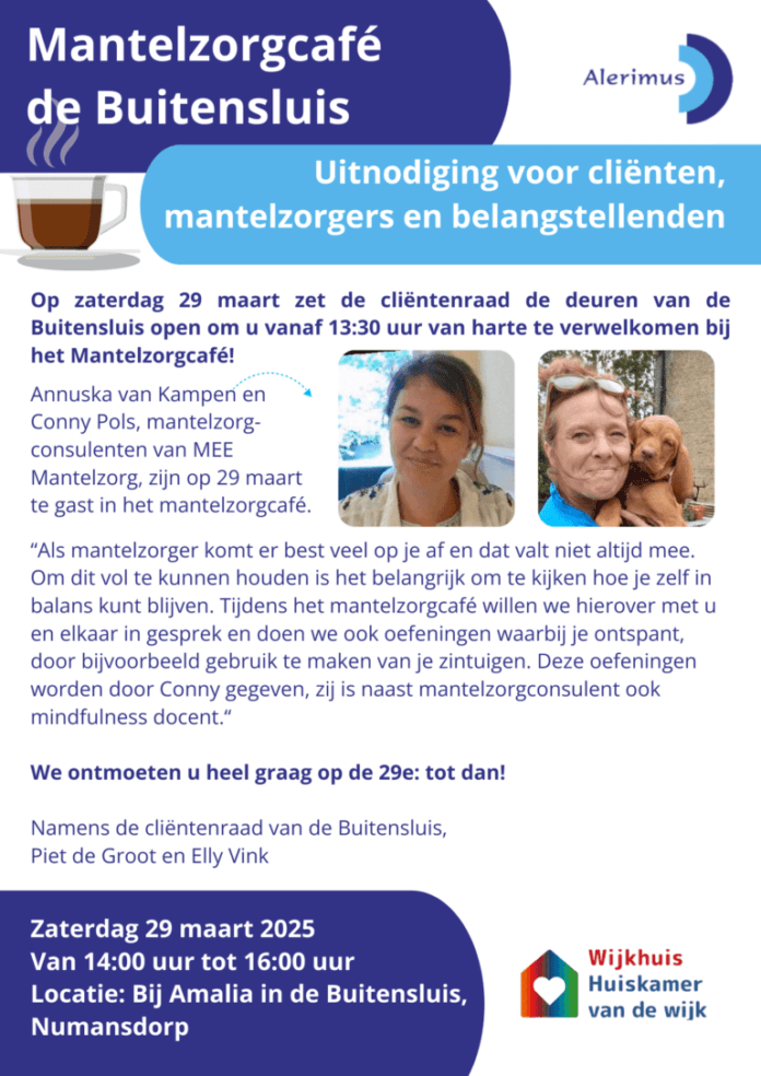 Numansdorp – Op zaterdag 29 maart organiseert de cliëntenraad van Alerimus, locatie De Buitensluis in Numansdorp, een Mantelzorgcafé. Mantelzorgers, cliënten en belangstellenden zijn van 14.00 tot 16.00 uur van harte welkom.