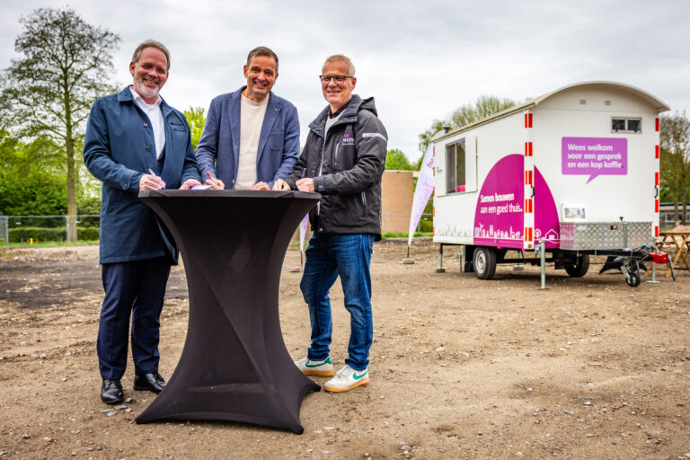 Vandaag ondertekenden directeur-bestuurders Dennis Lausberg en Johan Schudde van HW Wonen en directeur Marinus den Harder van Trebbe de aannemingsovereenkomst voor het nieuwbouwproject Laning in Puttershoek. Speciaal voor de ondertekening werd de mobiele huiskamer van HW Wonen op de bouwplaats gezet.