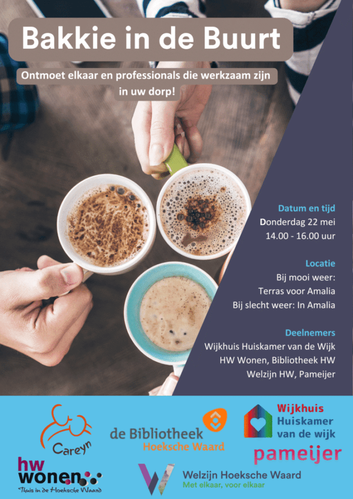 Er zijn die middag ook vertegenwoordigers aanwezig van onder andere Welzijn Hoeksche Waard, Alerimus, Pameijer, de Bibliotheek Hoeksche Waard (digitaal loket), HW Wonen en Careyn. Heeft u een vraag over zorg of welzijn, of gewoon zin in wat gezelligheid? Loop dan gerust binnen. De koffie staat klaar in Amalia, aan de Bernhardstraat 25 in Numansdorp. Bij mooi weer zitten we lekker op het terras.