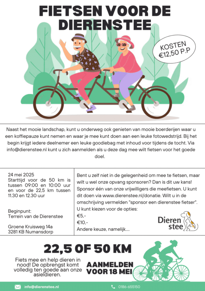 Numansdorp – Op zaterdag 24 mei organiseert Dierenopvangcentrum De Dierenstee een gezellige fietstocht voor het goede doel. Deelnemers kunnen kiezen uit een route van 22,5 of 50 kilometer door het mooie Hoeksche Waardse landschap, met onderweg stops bij boerderijen, een koffiepauze en zelfs een fotowedstrijd.