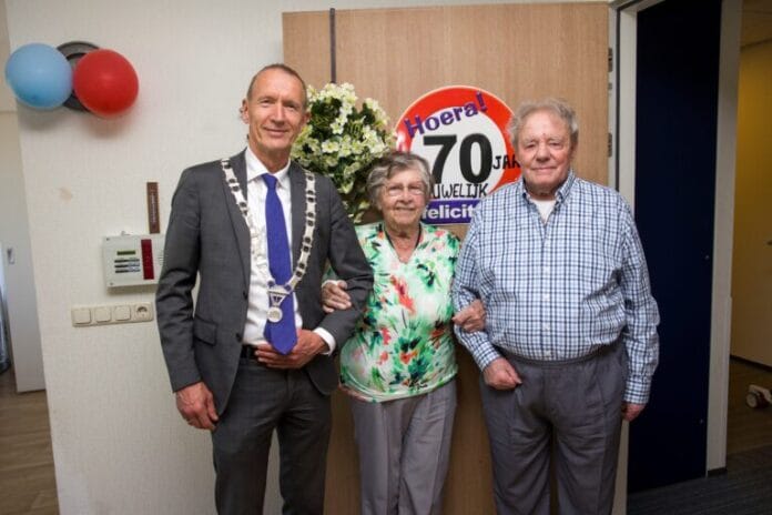 Vandaag, 12 mei, was het 70 jaar geleden dat de heer J.C. Molendijk (97) en mevrouw L.C. Molendijk-de Pijper (92) elkaar het jawoord gaven. Burgemeester Erik van Heijningen feliciteerde het echtpaar vanmiddag namens het gemeentebestuur met hun platina huwelijksjubileum en bracht een boeket bloemen mee.