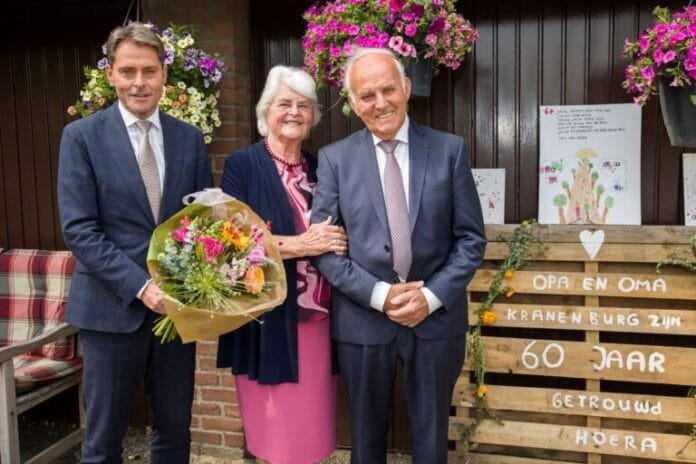 Het was op 20 mei 60 jaar geleden dat meneer P. Kranenburg (82) en mevrouw C. Kranenburg-Kooij uit Piershil in het huwelijksbootje stapten. Mevrouw Kooij was gisteren, op haar trouwdag, jarig en is 80 jaar geworden. Wethouder Paul Boogaard ging vanmiddag langs met een mooie bos bloemen. Hij feliciteerde hen namens het gemeentebestuur met dit diamanten jubileum.