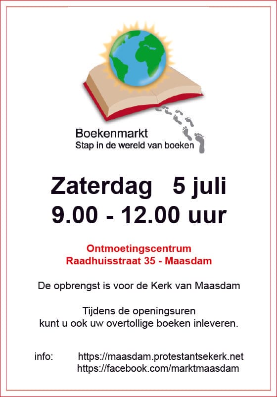 Zaterdag 5 juli is de boekenmarkt in Maasdam! Tussen 09.00 en 12.00 uur bent u van harte welkom in Ontmoetingscentrum Raadhuisstraat 35 in Maasdam om te snuffelen tussen de boeken.De opbrengst is voor de Kerk van Maasdam.