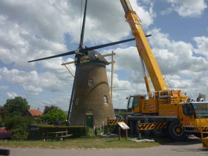 PUTTERSHOEK – Met indrukwekkend hijswerk zijn op maandag 23 juni de nieuwe wieken en het staartwerk geplaatst op korenmolen De Lelie aan de Molendijk in Puttershoek. De klus werd uitgevoerd door molenbouwers van de Restauratie Werkplaats Schiedam, met hulp van een enorme kraanwagen van Kraanverhuur Tuk uit Klaaswaal.