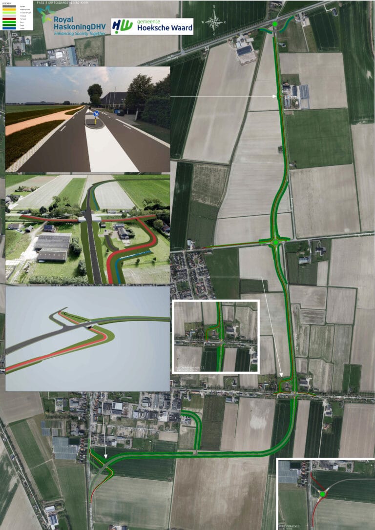 Naast het ontwerp van de korte randweg brachten wij het ruimtegebruik in beeld van een mogelijk toekomstige verlengde randweg 80 km/uur. De verbindingsweg aan de zuidkant van Klaaswaal wordt met een rotonde op de randweg aangesloten. De randweg wordt verdiept aangebracht bij de kruising met de Boomdijk en bij de aansluiting op de Energieweg is rekening gehouden met een rotonde.