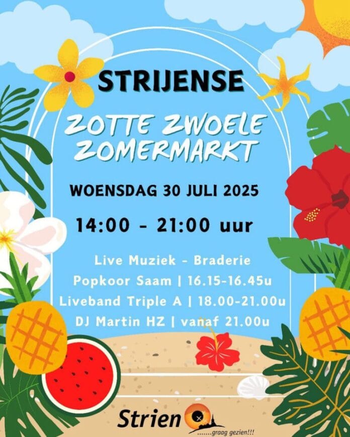STRIJEN – Op woensdag 30 juli 2025 verandert het dorpshart van Strijen in een bruisend zomers festijn tijdens de Strijense Zotte Zwoele Zomermarkt. Van 14.00 tot 21.00 uur kunnen bezoekers genieten van een kleurrijke mix van live muziek, braderie, tropische sfeer en gezelligheid.