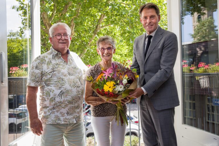 Wethouder Paul Boogaard bracht het echtpaar vanmiddag een bezoek en overhandigde namens het gemeentebestuur een mooie bos bloemen.