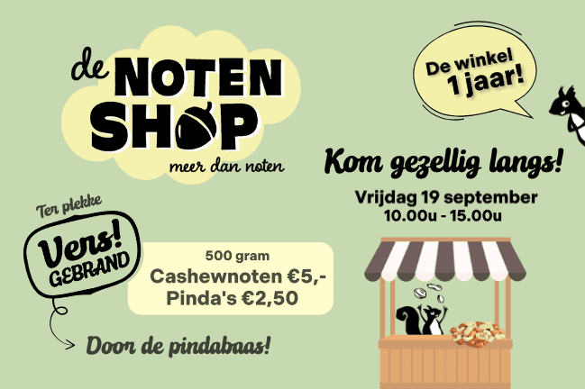 Aanstaande vrijdag 19 september staat in het teken van het 1-jarig bestaan. Van 10.00 uur tot 15.00 uur staat niemand minder dan De Pindabaas buiten bij de winkel om verse noten te branden. De heerlijke geur van vers gebrande noten zal je al van ver tegemoetkomen!