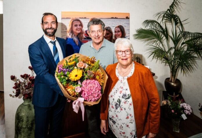 Het was 24 september 60 jaar geleden dat meneer H.M. Braal (83) en mevrouw C. Braal-Nelis (81) uit Klaaswaal in het huwelijksbootje stapten. Wethouder Hein Verbiest ging vanochtend langs met een mooie bos bloemen. Hij feliciteerde hen namens het gemeentebestuur met dit diamanten jubileum.