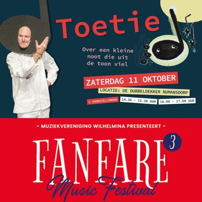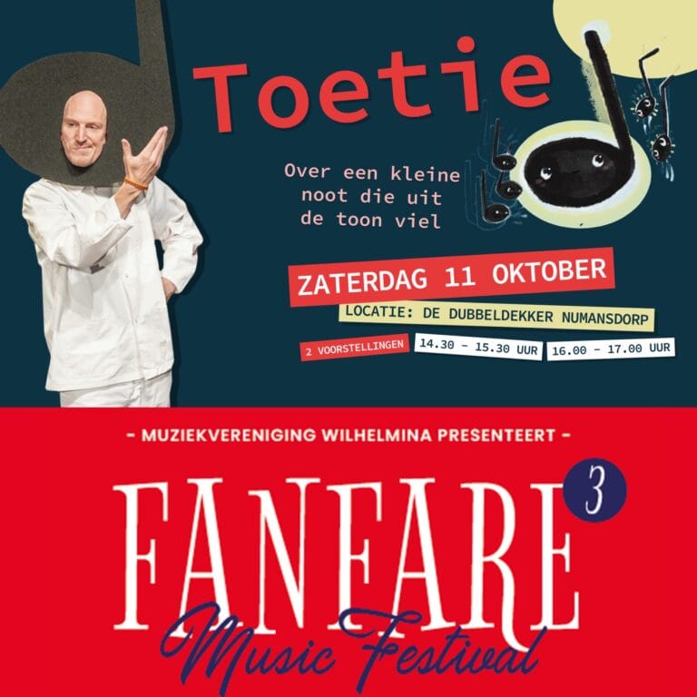 Op zaterdag 11 oktober 2025 viert Muziekvereniging Wilhelmina uit Numansdorp de kracht van muziek met een dubbele muzikale belevenis. Overdag staat de muziektheatervoorstelling Toetie gepland in IKC De Dubbeldekker, en ’s avonds is Sporthal Numansdorp het podium voor het Fanfare³ Music Festival. Twee evenementen op één dag, die jong en oud laten ervaren hoe bijzonder muziek maken samen kan zijn.