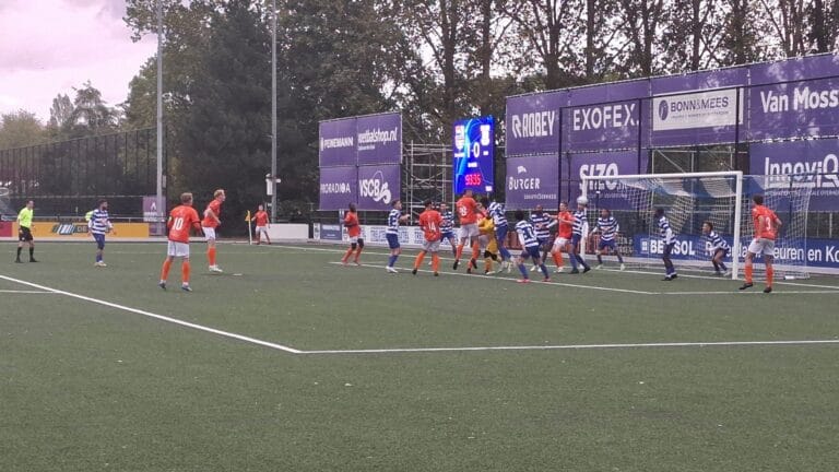 Na een assist van Rik Schouten zag Dedier Bos zijn schot smoren in de blauw/witte afweer. Ook Schouten zelf kreeg een prima mogelijkheid maar schoot voorlangs en een paar hoekschoppen leverden wel het nodige gevaar op maar verder dan een kopbal van Dylan de Vroed met een ‘tik’ van de bal tegen de paal kwam het niet.