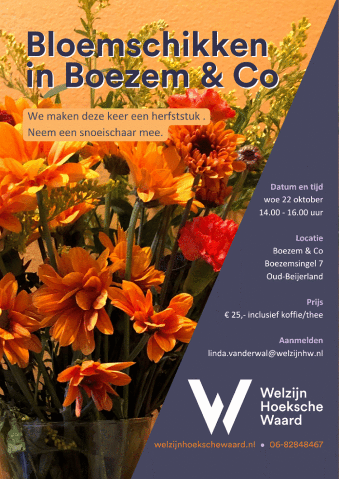 Houdt u ook zo van de herfst? Van gezellige lichtjes en warme momenten, en natuurlijk van een prachtig herfststuk! Kom op woensdag 22 oktober naar Boezem & Co en laat uw creativiteit bloeien. Van 14.00 tot 16.00 uur maken we samen een sfeervol herfststuk en genieten we van een heerlijk kopje koffie of thee met iets lekkers.