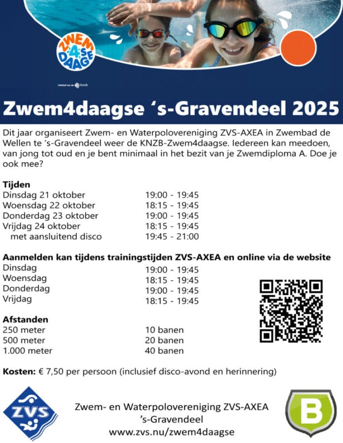 Dinsdag 21 t/m vrijdag 24 oktober 2025 organiseert Zwem- en Waterpolovereniging ZVS tijdens de herfstvakantie de KNZB-Zwem4daagse in Zwembad de Wellen te ’s-Gravendeel.