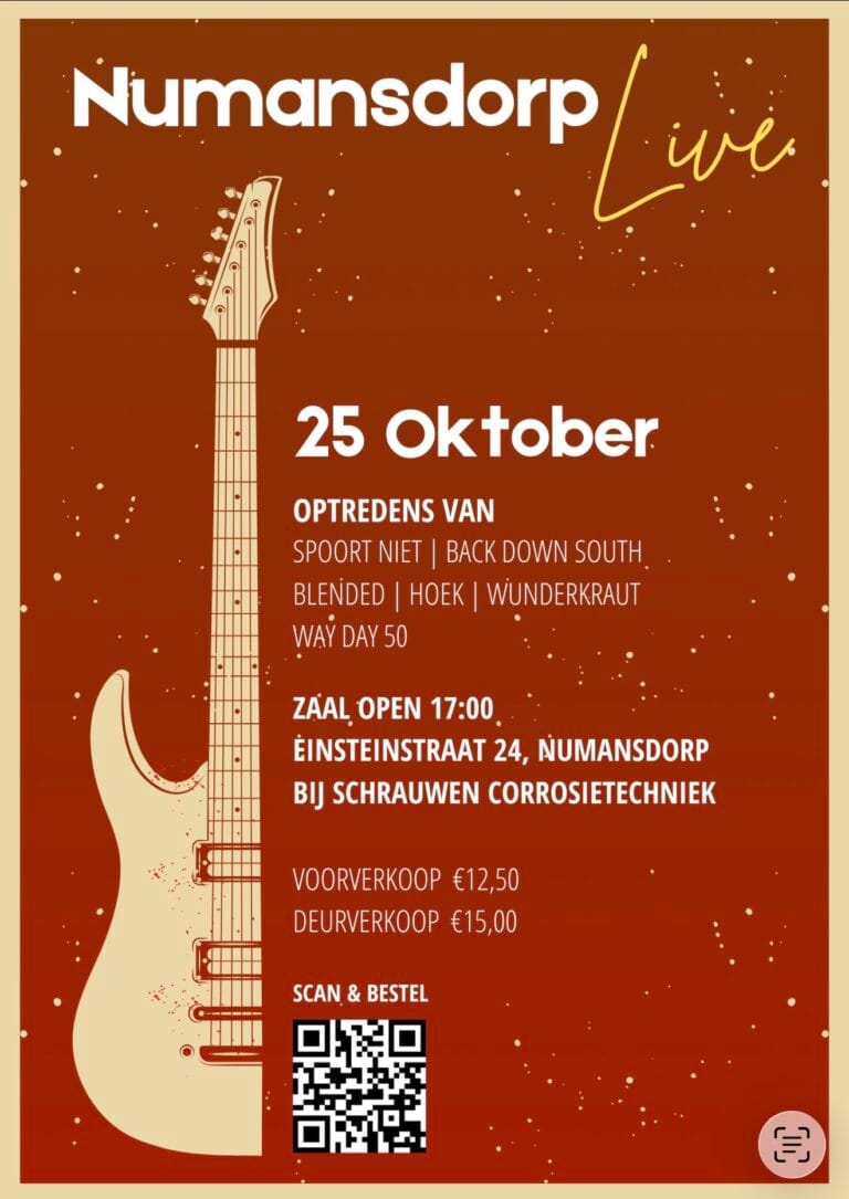 Zaterdag 25 oktober 2025 staat Numansdorp in het teken van live muziek tijdens Numansdorp Live. Vijf Hoeksche Waardse bands verzorgen een herkenbare mix van Nederlandstalige en Engelstalige pop en (lichte) rock.