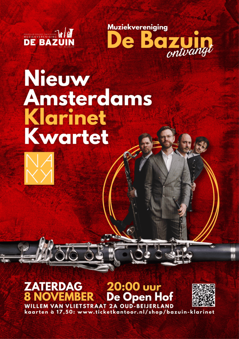 Op zaterdag 8 november geeft het harmonieorkest van Muziekvereniging De Bazuin haar traditionele najaarsconcert in De Open Hof. Dit jaar is het podium extra bijzonder: de muzikanten delen het podium met het Nieuw Amsterdams Klarinet Kwartet (NAKK).