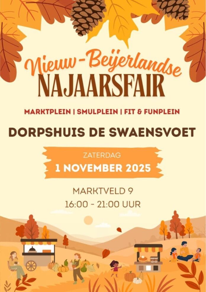 Nieuw-Beijerland – Op zaterdag 1 november 2025 vindt in dorpshuis De Swaensvoet de Nieuw-Beijerlandse Najaarsfair plaats. Van 16.00 tot 21.00 uur kunnen bezoekers genieten van een sfeervolle herfstmarkt vol activiteiten, lekkernijen en lokale producten.