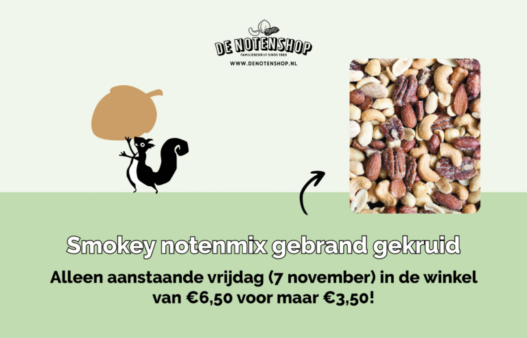 Alleen aanstaande vrijdag (7 november) kun je in de winkel van De Notenshop een heerlijke smokey, notenmix krijgen voor slechts €3,50! Deze mix bestaat uit cashewnoten, pecannoten, pinda’s, amandelen en hazelnoten. Een heerlijke notenmelange!