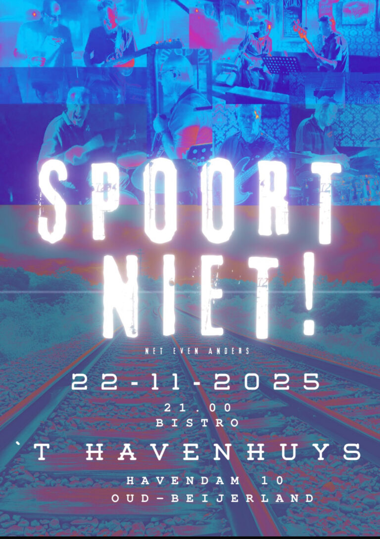OUD-BEIJERLAND – De band Spoort Niet sluit op zaterdag 22 november 2025 hun tour af met een spetterend optreden in Bistro ’t Havenhuys. Zoals altijd belooft de avond een energieke mix van pop, rock & lol, met volop ruimte voor humor en herkenbare klassiekers.
