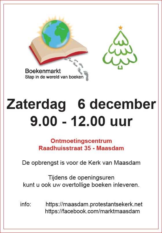 Maasdam – Op zaterdag 6 december 2025 organiseert het Ontmoetingscentrum aan de Raadhuisstraat 35 de boekenmarkt ‘Stap in de wereld van boeken’. Van 9.00 tot 12.00 uur kunnen bezoekers snuffelen tussen een groot aanbod aan kinderboeken, romans, streekverhalen, geschiedenisboeken en spannende literatuur.