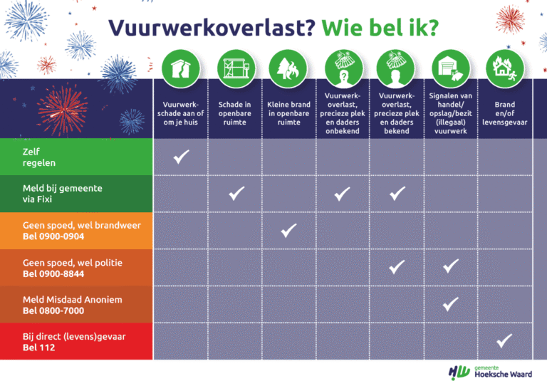 Er komen weer regelmatig meldingen van vuurwerkoverlast bij ons binnen. In bovenstaand overzicht staan de verschillende soorten overlast vermeld én bij wie u dit kunt melden.