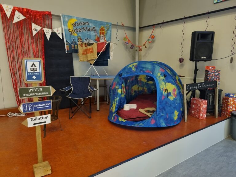 De kinderen zijn razend benieuwd wie er precies kampeert — en vooral hoe dat moet op 5 december, wanneer Sinterklaas juist op hetzelfde podium wordt ontvangen…