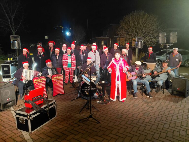 Het Flohil-marktplein in Numansdorp stond vrijdagavond bomvol tijdens het concert van Shantykoor De Hoeksche Waard. Van 19.00 tot 21.00 uur bracht het koor, onder leiding van Kerstvrouw Paula van Wanrooy, een sfeervol en afwisselend optreden.