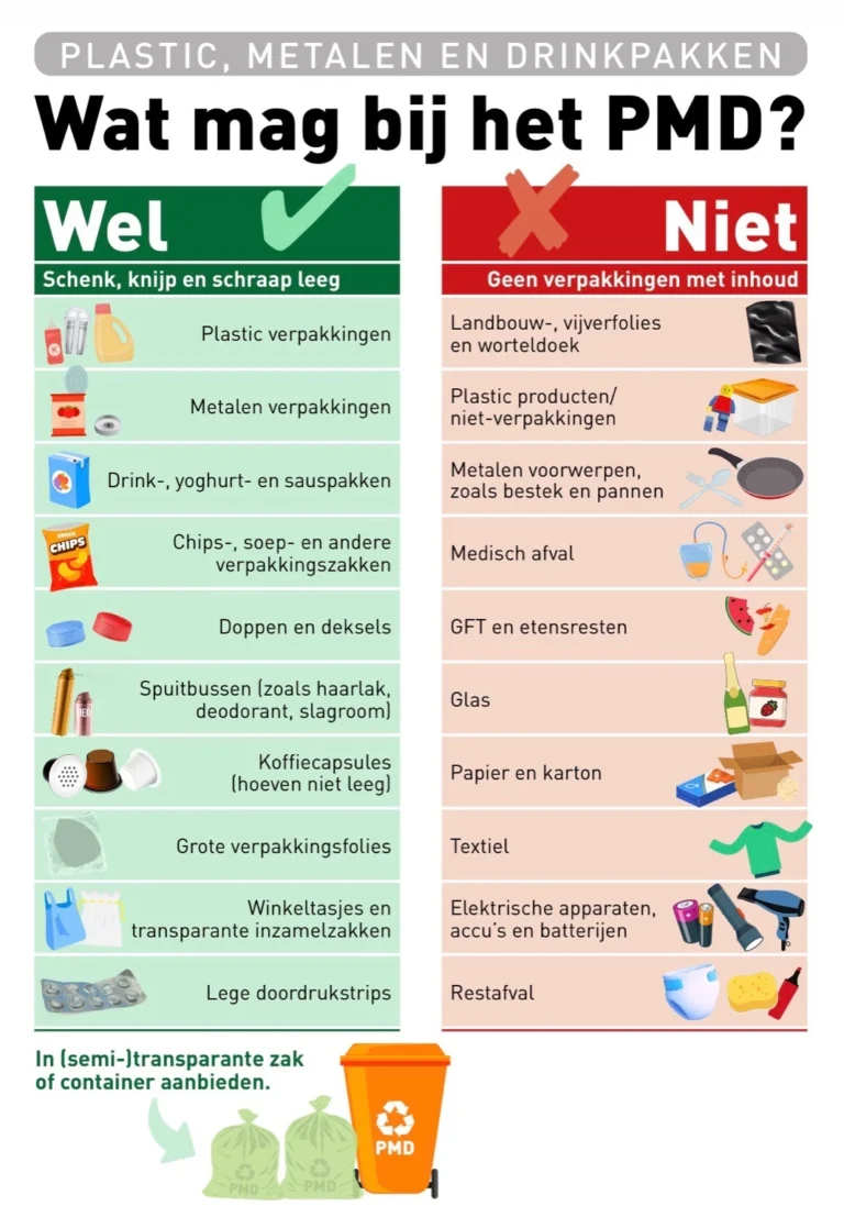 Vanaf 1 januari 2026 geldt in heel Nederland een vernieuwde landelijke Wel/Niet-lijst voor PMD-afval. Deze lijst geeft duidelijke richtlijnen over wat wel en niet bij het PMD (Plastic, Metaal en Drinkpakken) mag. Het doel: afval scheiden eenvoudiger maken voor huishoudens en zo de recycling verder verbeteren.