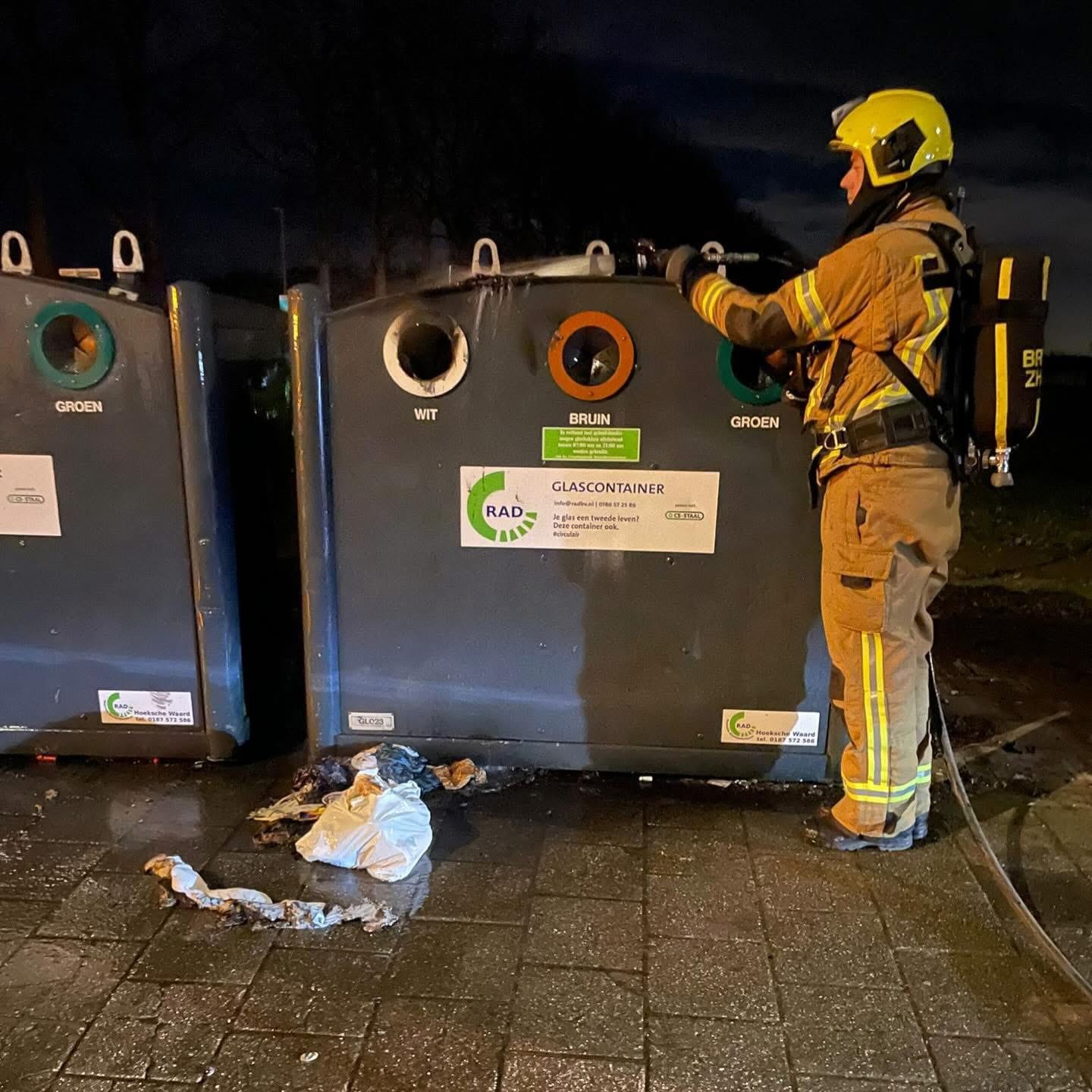 De brandweer heeft in eerste instantie gewacht op de politie om de situatie veilig te laten verlopen. Nadat de groep was vertrokken, kon de brandweer ter plaatse komen en de brand op en rondom een glasbak blussen.