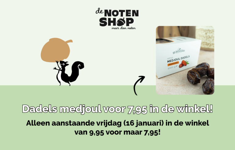 Shop deze vrijdag Medjoul dadels met korting! Ben jij gek op zoet en lekker snacken? Dan zijn deze dadels van ons eigen huismerk echt iets voor jou! Deze vrijdag (16januari) shop je Medjoul dadels 1000 gram voor maar 7,95 in de winkel van De Notenshop.
