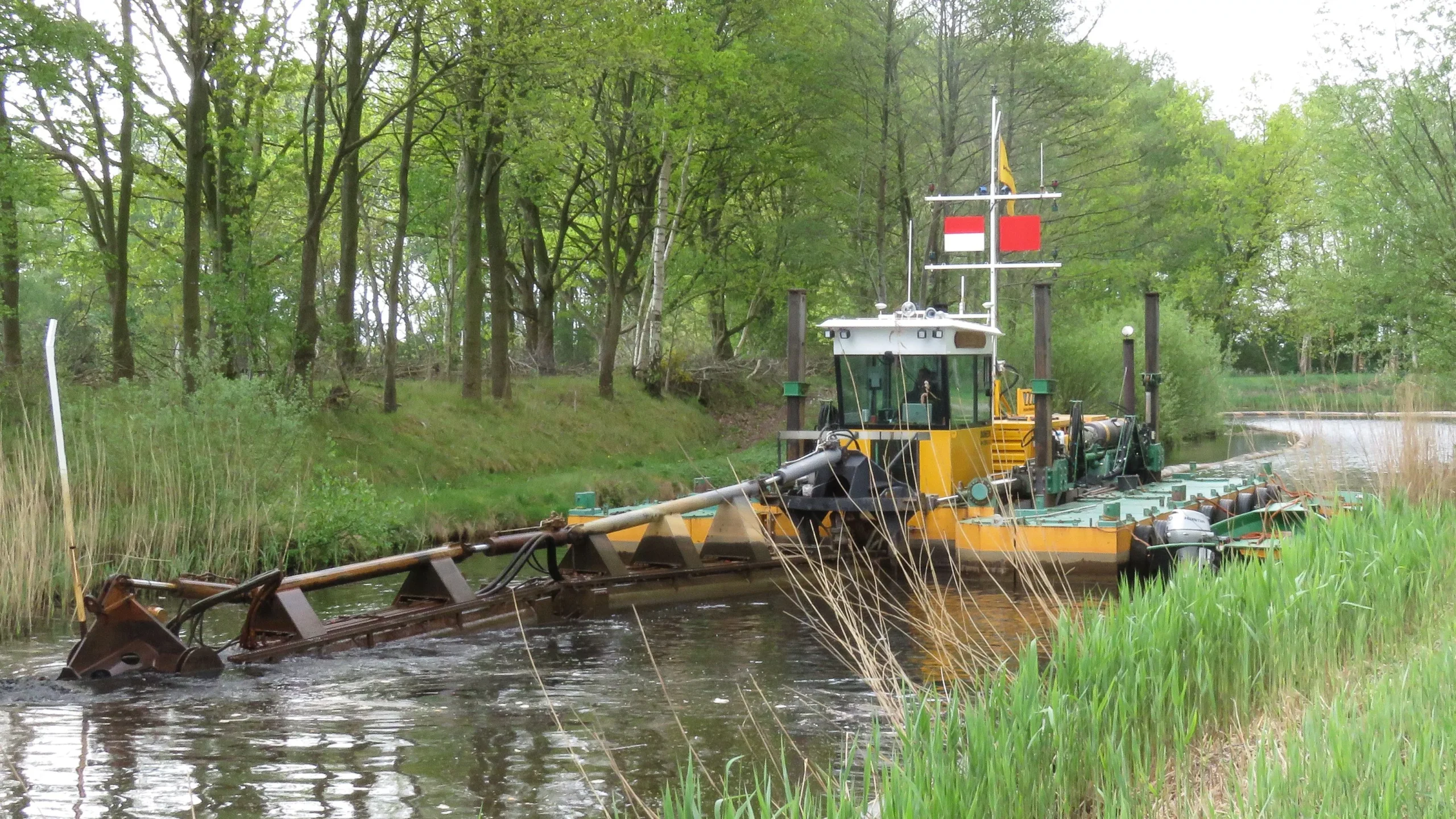Het zuidelijke haventje wordt gebaggerd met een schuifboot; de bagger wordt naar de plas geschoven en daar door de cutterzuiger opgezogen.