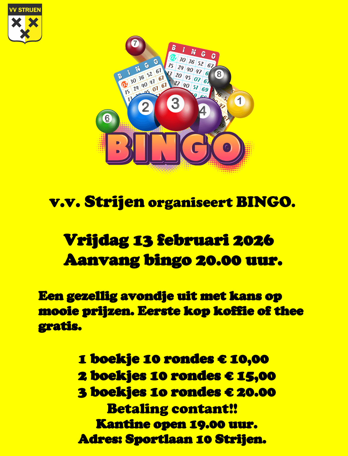 STRIJEN – Voetbalvereniging v.v. Strijen organiseert op vrijdag 13 februari 2026 een gezellige bingoavond in de kantine aan de Sportlaan. De bingo start om 20.00 uur, de kantine is open vanaf 19.00 uur.