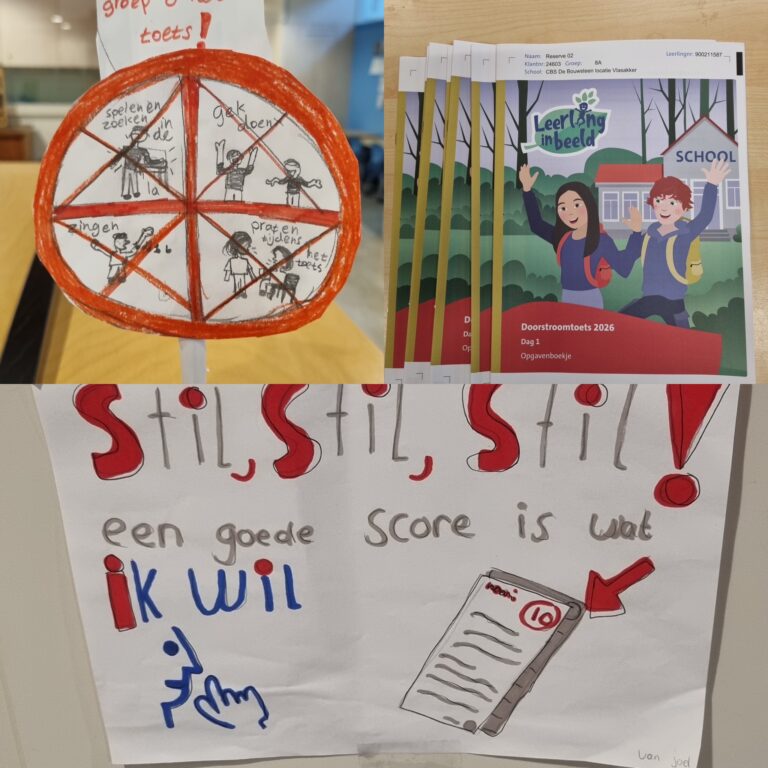 Als voorbereiding op de toets ochtenden, maakten de kinderen bordjes met daarop kreten en tekeningen om iedereen in de school duidelijk te maken, dat ze bezig zijn met dè toets en of iedereen daar wel rekening mee wil houden!