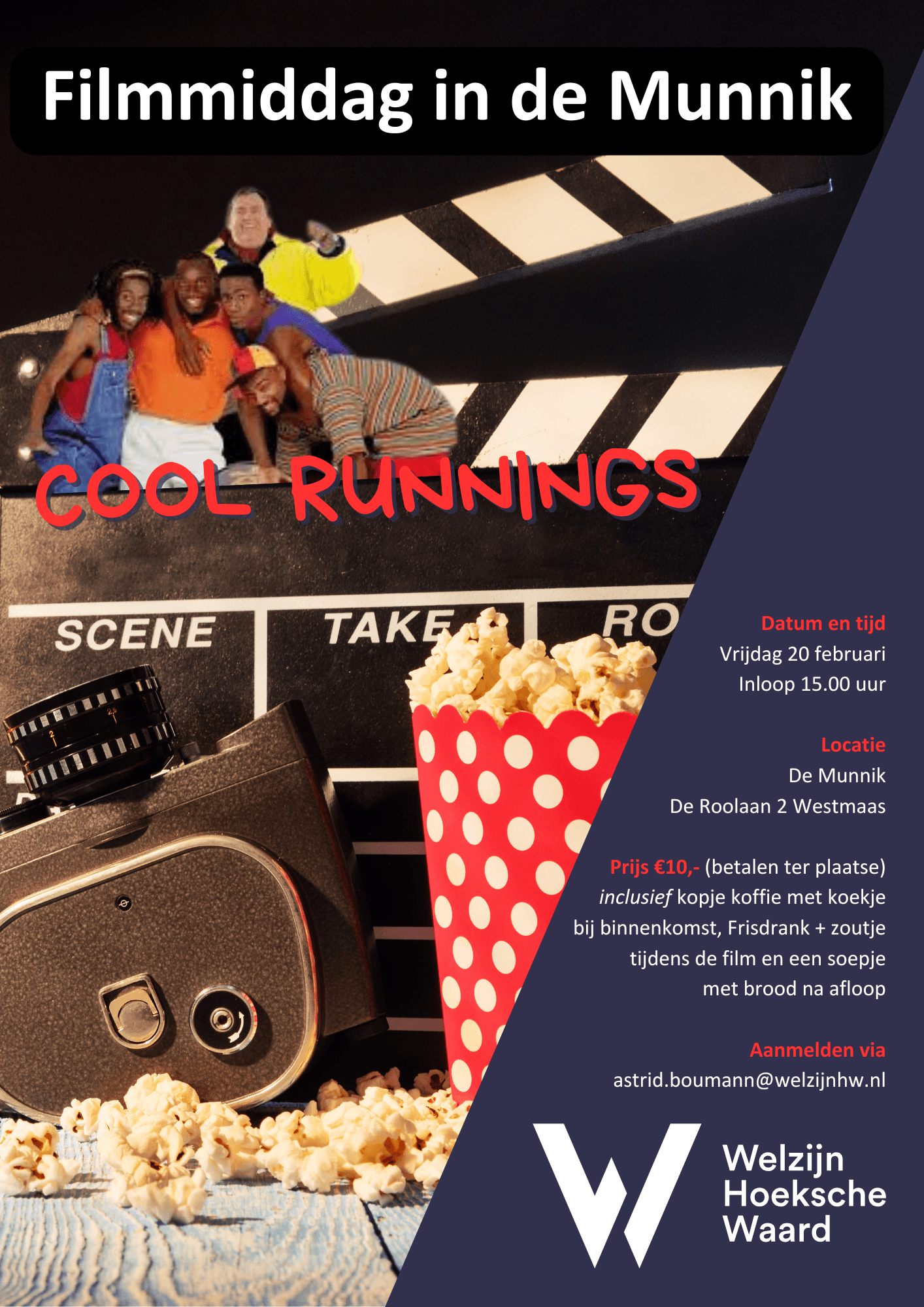 Na het succes van de filmmiddag in januari organiseert Welzijn Hoeksche Waard ook in februari en maart opnieuw gezellige filmmiddagen voor volwassenen in ontmoetingscentrum De Munnik in Westmaas. Op vrijdag 20 februari wordt de Disneyfilm Cool Runnings vertoond.