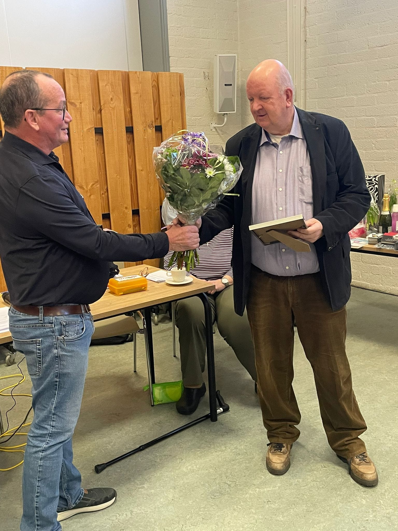 Voorzitter Fons Hinten overhandigde de jubilaris een bos bloemen, een fraai jubileumcertificaat en een cadeaubon als blijk van waardering voor zijn jarenlange betrokkenheid.