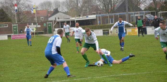 Tegen de straffe westenwind in zorgde Thimo Herrewijnen reeds na zeven minuten voor een 1-0 voorsprong door na een subtiel steekpassje van Thomas Gennissen de bal in de korte hoek achter doelman Rowan Orie te schieten. De mannen van trainer Pascal van den Hoek en zijn – afgelopen week voor een jaar bijgetekende – assistent Tim van der Velden hadden weinig te duchten van de tegenstanders uit Spijkenisse. Het lukte de voorhoede van de Fusieclub echter niet om het duidelijke veldoverwicht in doelpunten uit te drukken. Jacco Vink (over), Nils van Prooijen (tegen de keeper), Thimo Herrewijnen (tegen de paal) en Thomas van Peperstraten (mislukte rebound) hadden het vizier niet op scherp staan. Op slag van rust betaalde de thuisclub de tol voor alle onzorgvuldigheid. Doelman Bryan Huijzers redde eerst nog op een inzet van John Ackon, maar moest kort daarop zwichten voor een doeltreffende uithaal van de buitenspel staande Youri Reis: 1-1.
