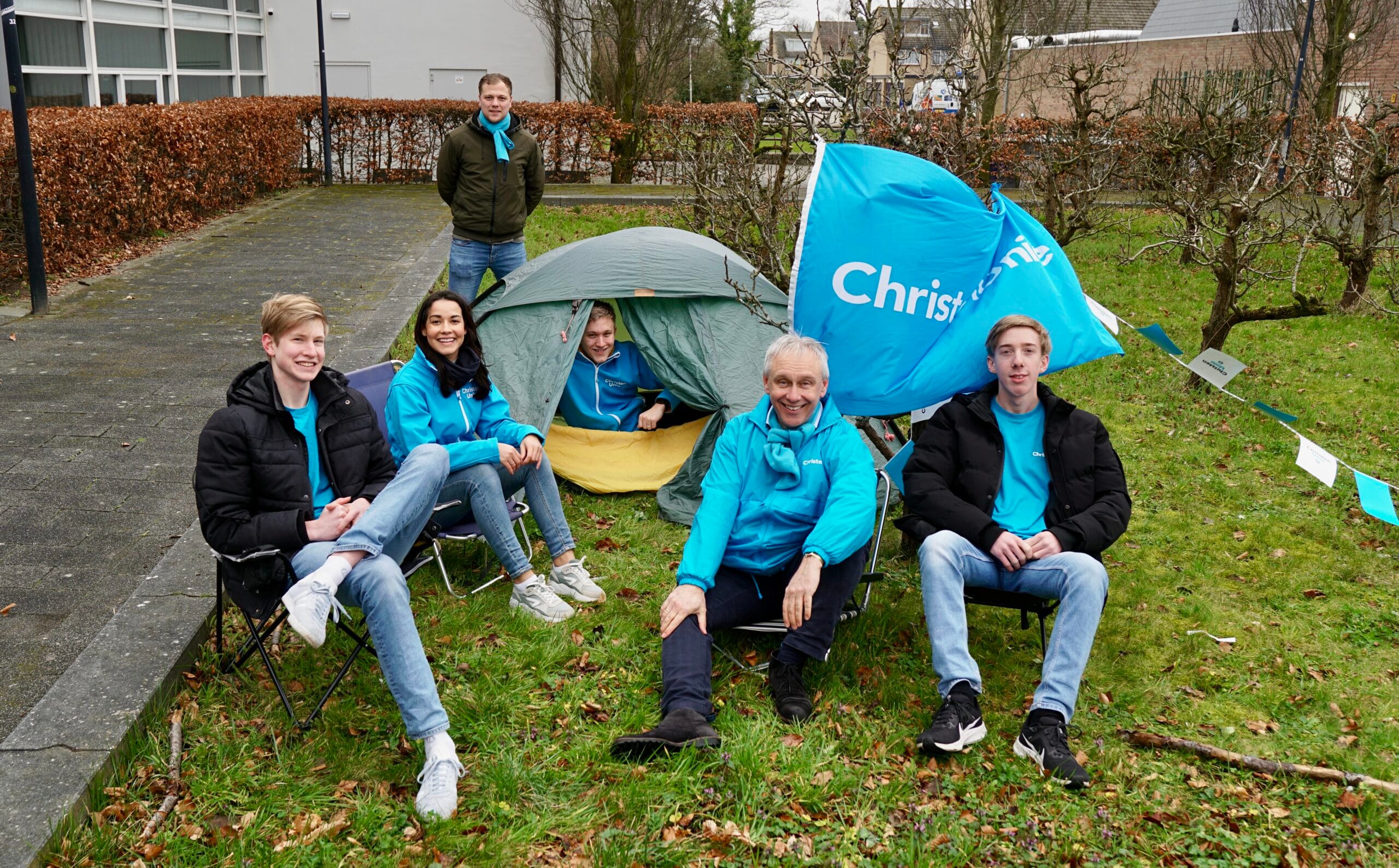 Met een knipoog zette de ChristenUnie Hoeksche Waard zaterdag een tent op voor het gemeentehuis in Oud-Beijerland.