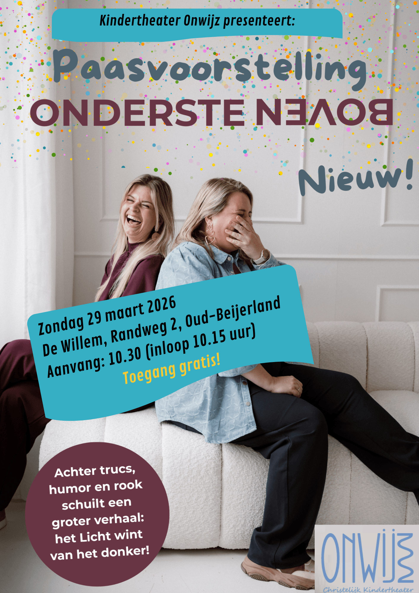 Op zondag 29 maart 2026 komt christelijk Kindertheater Onwijz naar Oud-Beijerland met een gloednieuwe paasvoorstelling voor kinderen én volwassenen. ‘Ondersteboven’ is een mix van toneel, trucs, humor en veel interactie. De voorstelling wordt gegeven in CSG De Willem in Oud-Beijerland, en wordt aangeboden door de Kerk van de Nazarener Hoeksche Waard. De voorstelling begint om 10.30 uur (inloop vanaf 10.15 uur) en is gratis toegankelijk.